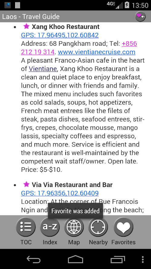 ✔ The top restaurants have been individually selected by MobileReference editors. These restaurants are marked by a star in the EAT chapter and are plotted on the GPS map.