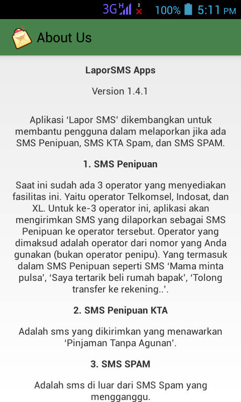 Aplikasi 'Lapor SMS' dikembangkan untuk membantu pengguna dalam melaporkan jika ada SMS Penipuan, SMS KTA Spam, dan SMS SPAM.