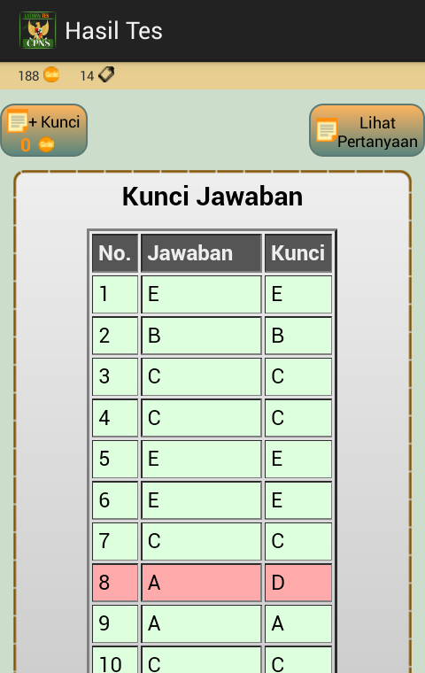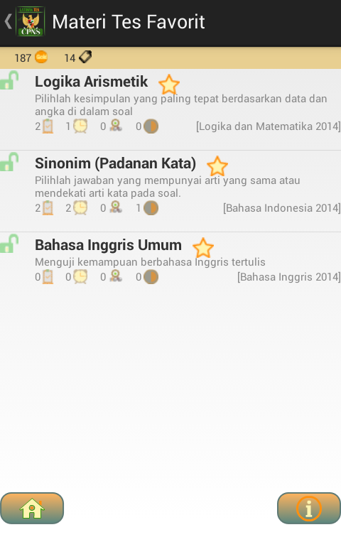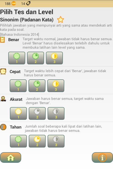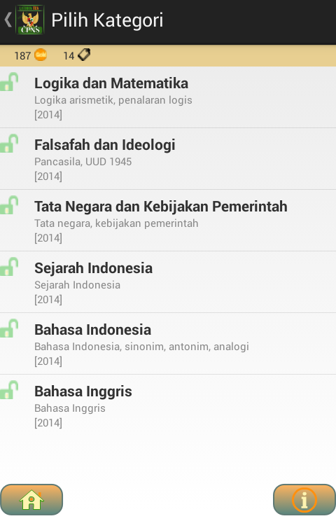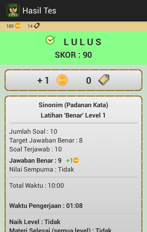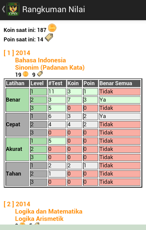 9. Sistem Koin untuk mengaktifkan materi soal, dan bisa didapatkan dengan menyelesaikan tes sesuai target. Diharapkan dengan sistem Koin, peserta latihan bisa terdorong untuk mengumpulkan koin sebanyak-banyaknya sehingga lebih banyak materi soal yang bisa dimainkan.