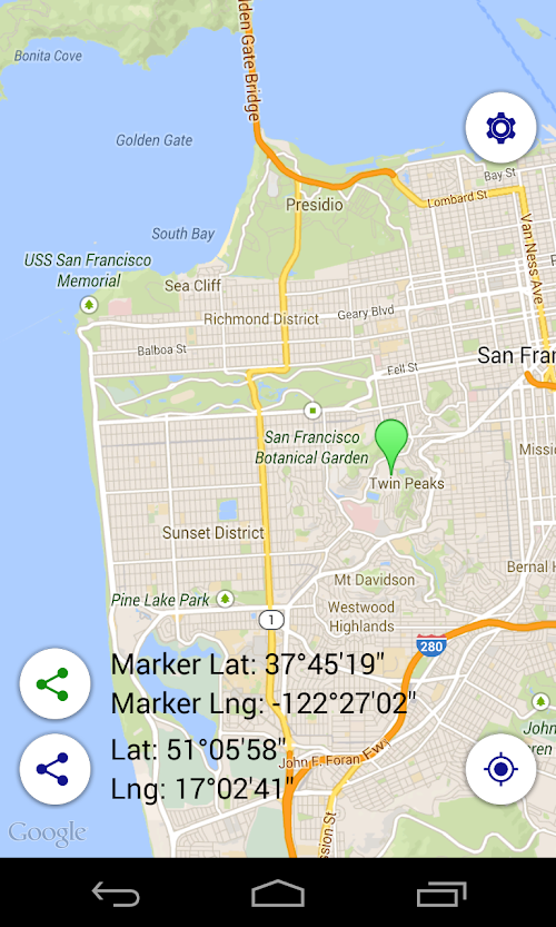 If you don't want to share your location and want to share some other location (based on latitude and longitude) instead, just click the place that you need in the map and you will see green marker appear. To share blue marker you should click Share green marker location button near marker latitude and longitude coordinates. To remove green marker from the map, klick it again and it will disappear. Or press target button to move map to your current gps location and remove green marker. This way you can share location of any place of the map!