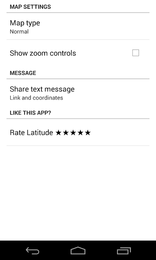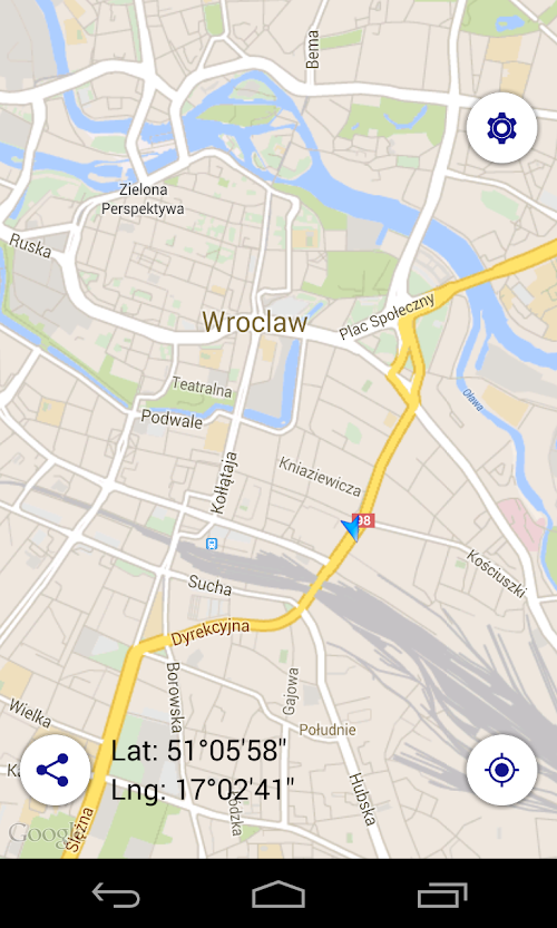 When you launch Latitude Location Share you will see your current gps location on the map. And you will see latitude and longitude of your gps location in the left corner of the map. If you want to share your location hit Share button near latitude and longitude coordinates. It is the easiest way to share location!