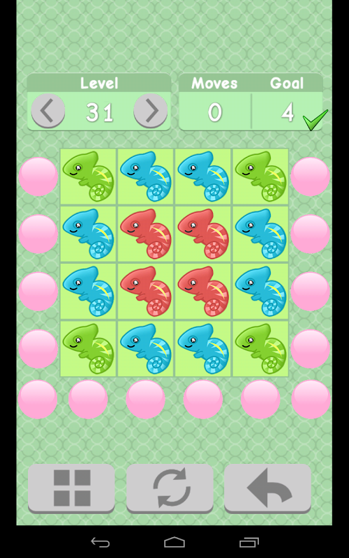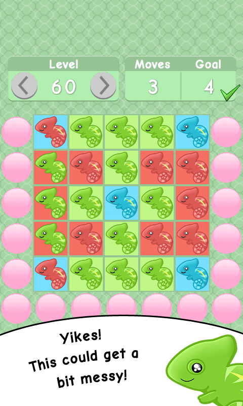 The game is composed of a grid of colored squares, and a grid of chameleons on top of the squares. By changing the colors of entire rows, columns, or diagonals of chameleons, the goal is to make all their colors match the block behind them. The early levels start off easy, but by the end of the 100 levels, it might have your head spinning!