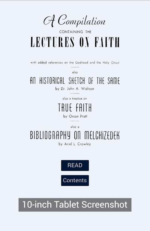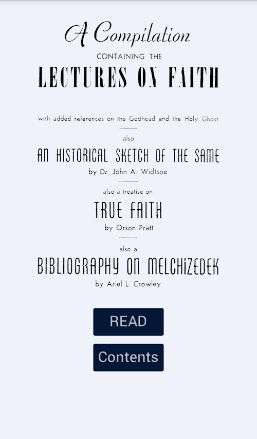 This app edition is the 1940 publication compiled by N.B. Lundwall, and includes - in addition to the Lectures on Faith - the Historical Sketch of the Lectures on Faith by Dr. John A. Widstoe, The Holy Ghost and the Holy Spirit by President Joseph F. Smith, True Faith by Elder Orson Pratt, and writings on Melchizedek included in the 1940 edition.