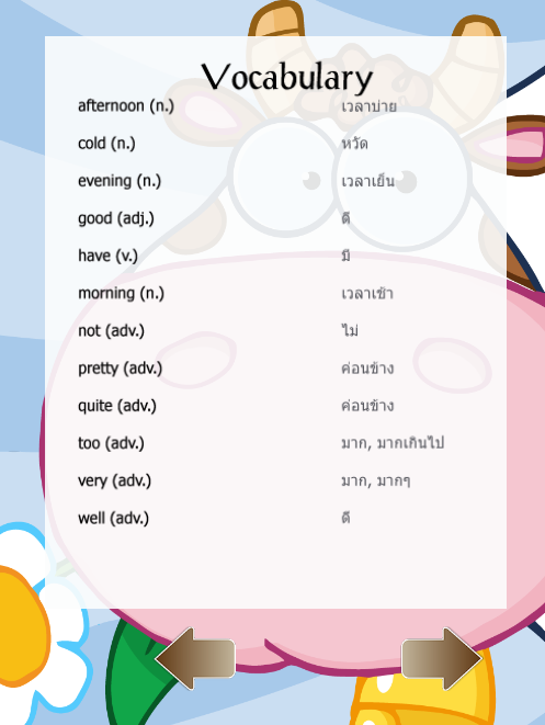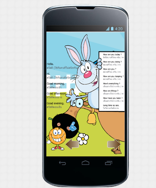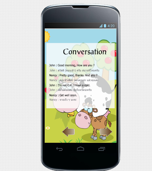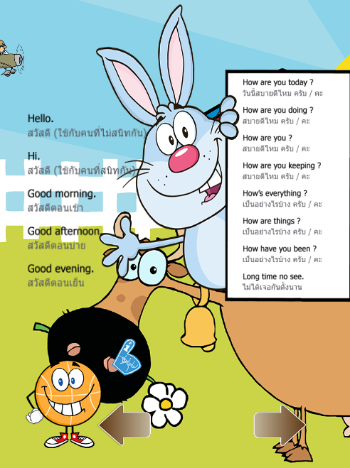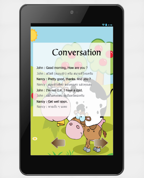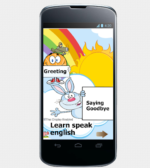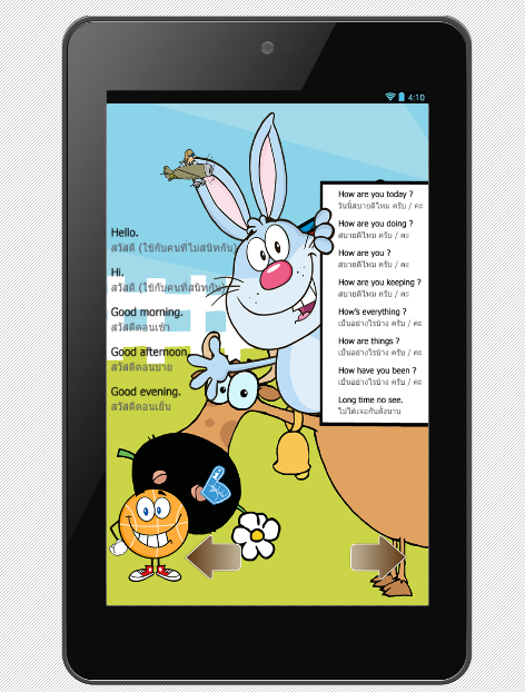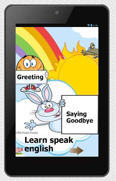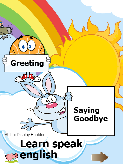 We can practice on their own With a different sentence with sentences and translations Thailand. Can display the translation or not. Listen to the sound development of the English language with more english vocabulary. Make learning English fun and easy for kids and beautiful pictures. English listening and Development The girls, boys, kids. Prepare preschool children As well as adults can improve your English conversation or spoken english for the better. With the English language or foreign language this. Can practice the language itself. This allows operators sentences to speak English better and better English grammar. Without going into the english course exam or test curriculum to make learning English. Through teaching English on the screen. The self-learning system teaches regularly. The sounds and improve your spoken English as well. Improve the reading, writing, listening examples speak English. To exercise tests, listening, reading and writing English pronunciation together to improve their English in a better future for the children will be able to communicate in foreign languages or English. And speak English better in this course for toddler or kindergarten or prescholl or grade 1st 2nd 3rd 4th 5th. You can speak english sentences everyday or dialy.