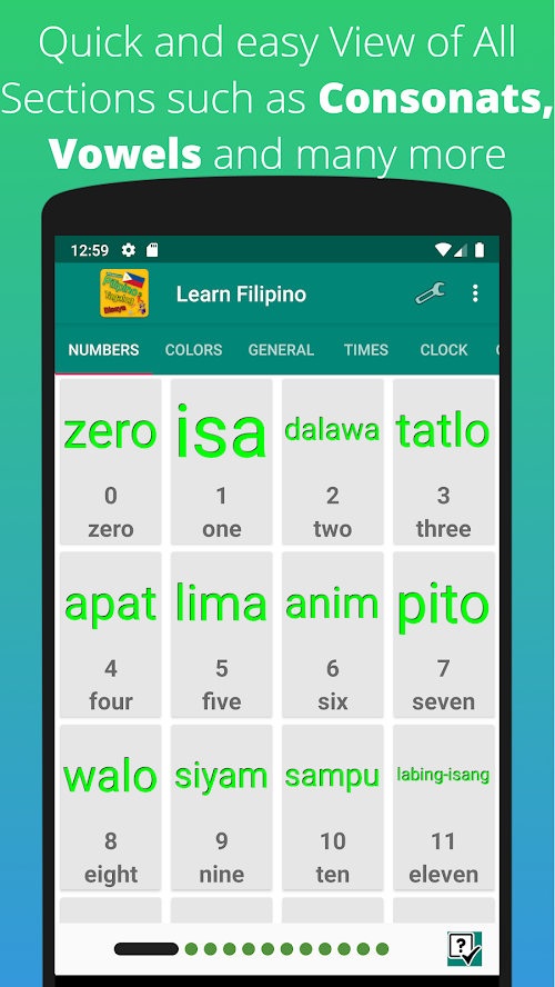 The Learn Filipino consists of 9 main parts that are accessible from the tabs at the top of the screen. These include Numbers, Colors, Days and Months, Clock reading, Durations, Questions, Pronouns, Animals, Family and Food.
