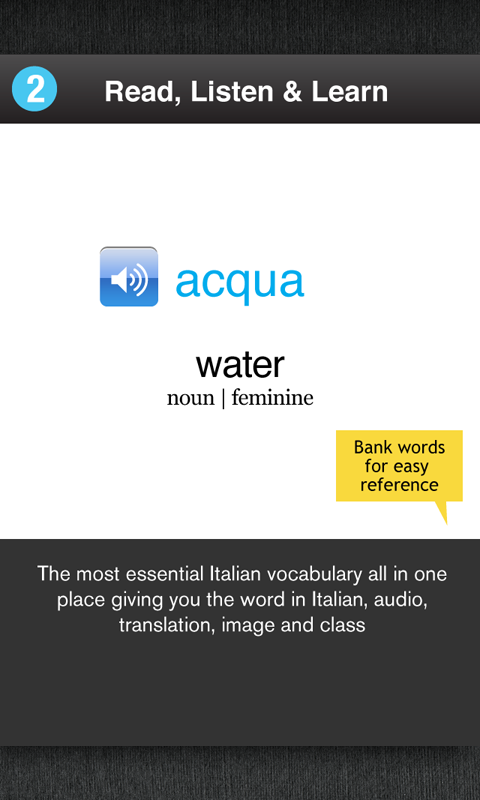 - Essential Italian vocabulary all in one place showing you the spelling, translation, pronunciation, image, class and gender (Note: You will need an internet connection for the initial download)