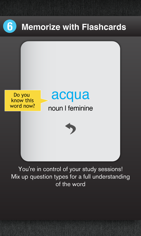 - Custom Flashcard Settings: You're in control of your study sessions. Mix up question types (recognition, production, audio and visual) for a full understanding of each word