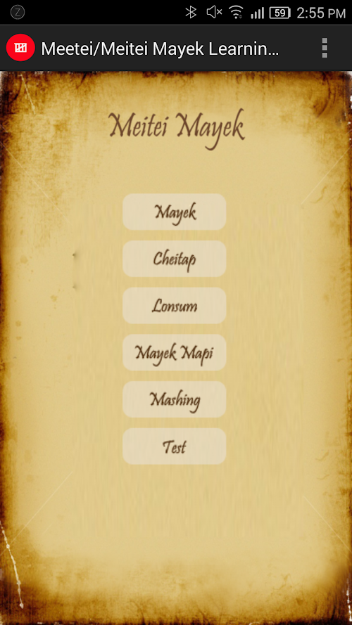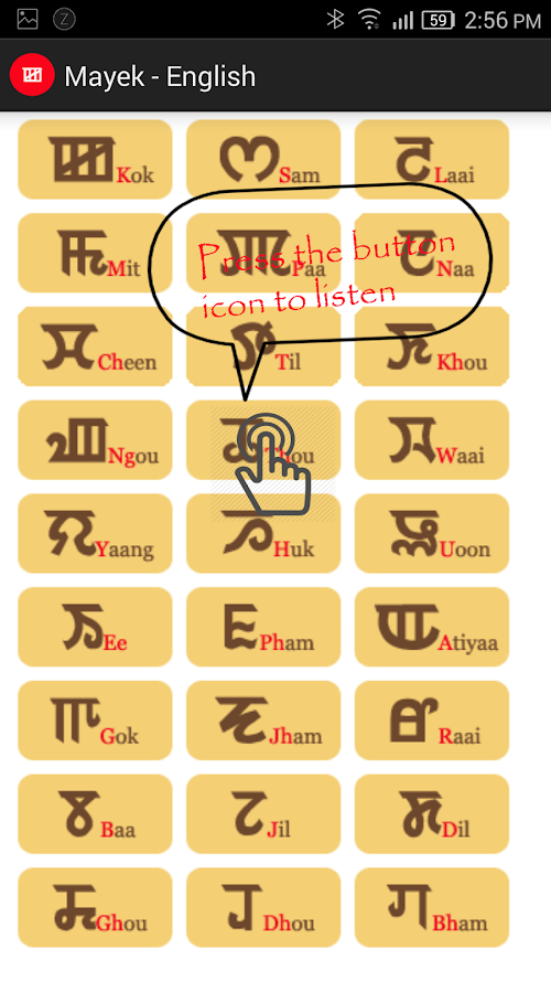 Meetei/Meitei Mayek is an official script of Manipur. This app will help you to learn and understand Manipuri script very easily and effectively with visual and native pronunciation.This app is designed with easy and smooth user interface. Our simple features will be your Guide to master Meetei/Meitei Mayek in the shortest time possible.