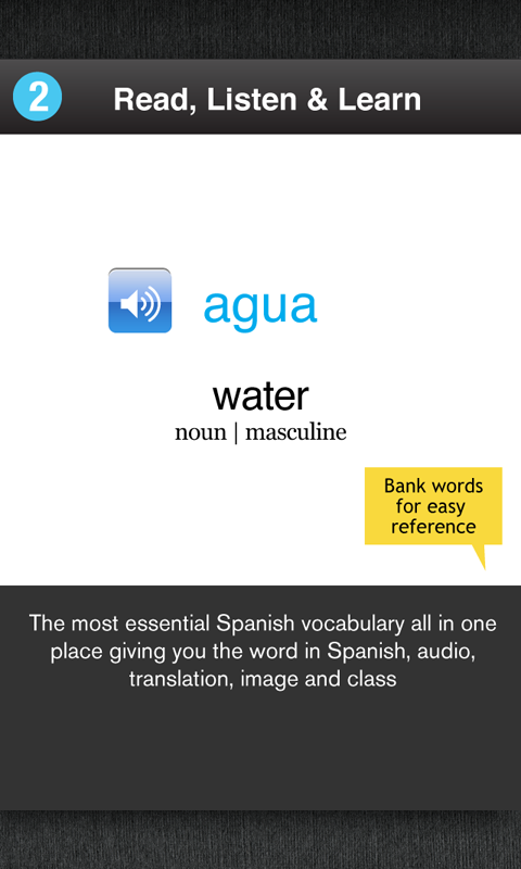 - Essential Spanish vocabulary all in one place showing you the spelling, translation, pronunciation, image, class and gender (Note: You will need an internet connection for the initial download)