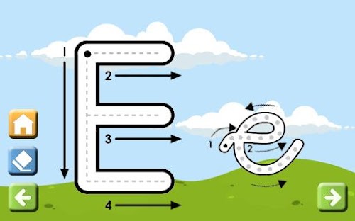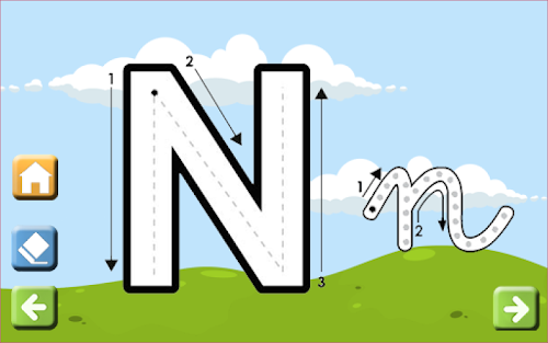 In this mode, the child will learn to write each letter. Each index card has a draw of the letter the child has to write (draw). A little arrows indicate the child the way of the drawing. So the child will learn to write the letter in uppercase and in lowercase, drawing it in the screen with the finger. In this mode it is important the help of the parents, encouraging the children to complete the number, at least in the first steps, when the child learn how to play.