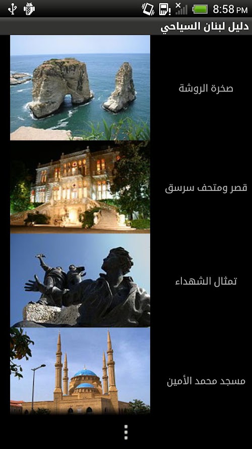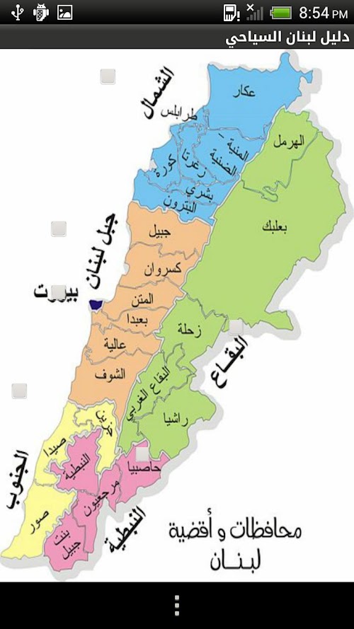 Is essential for everyone looking for touristic places, recreation or even more information about Lebanon , all are classified into 6 districts (Beirut, Mount of lebanon, North of lebanon, south of lebanon, Bekaa, Nabatieh) through an interactive map