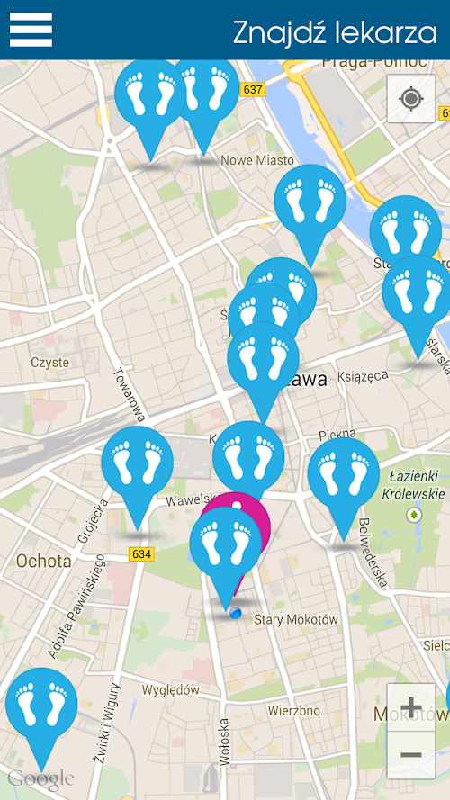 - mapę z funkcją geolokalizacji lekarzy znajdujących się w pobliżu miejsca, w którym aktualnie przebywasz