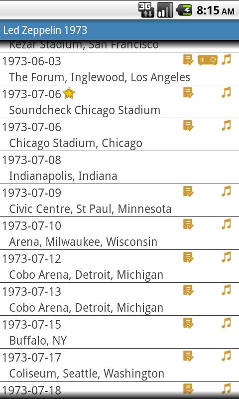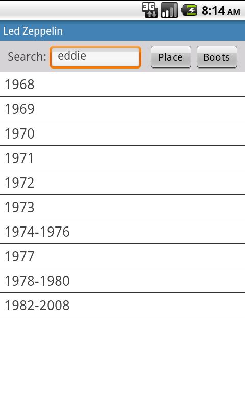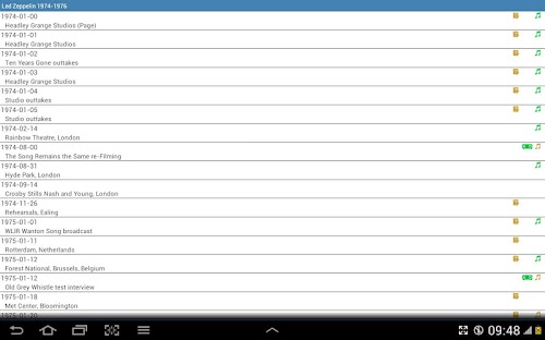 The full version has live show information covering 50 years, from the Yardbirds in 1963 to Robert Plant and the Band of Joy in 2011. Designed as a quick reference source for mobile use, it provides show dates and locations in chronological order - with setlist (songs/tracks) where known. Icons show if audio or video is known to exist, and bootleg titles are listed if they are known to exist.