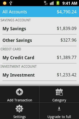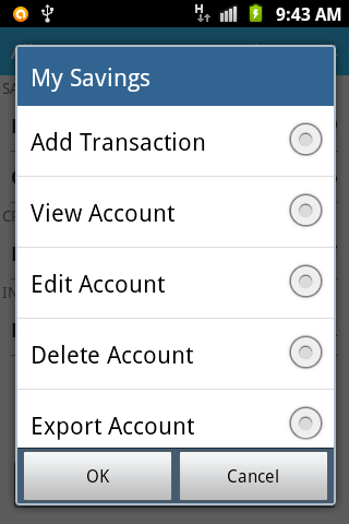 * Long tap on account to view options( Add transaction, View Account, Edit Account, Delete Account and Export your account transaction to SD card).