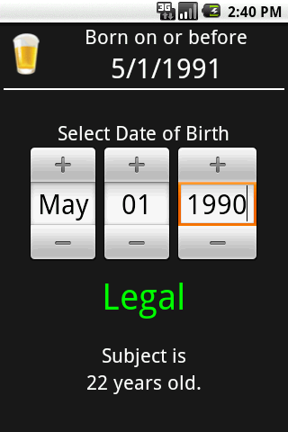 Also included is Legal Drinking Age Application that allows user to enter a date of birth to see a person’s age and if they are legally allowed to consume alcohol.