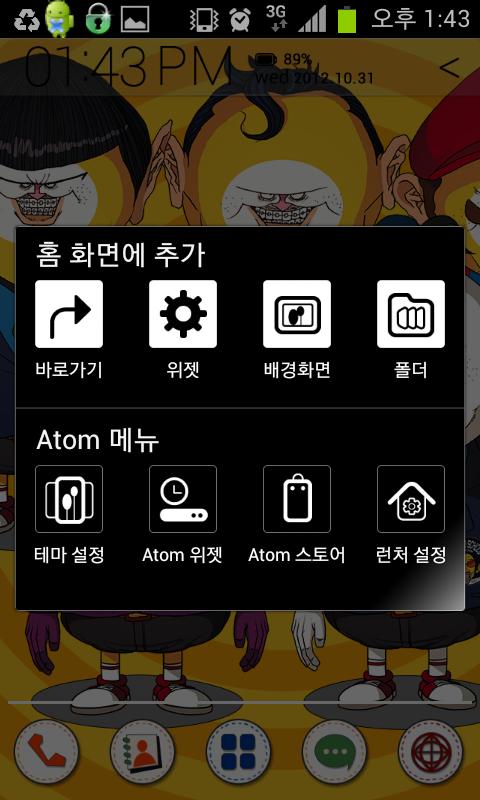 - Atom widget and menu on upper side screen: Tab and Hold (Long touch) on home screen