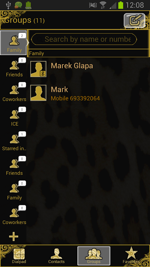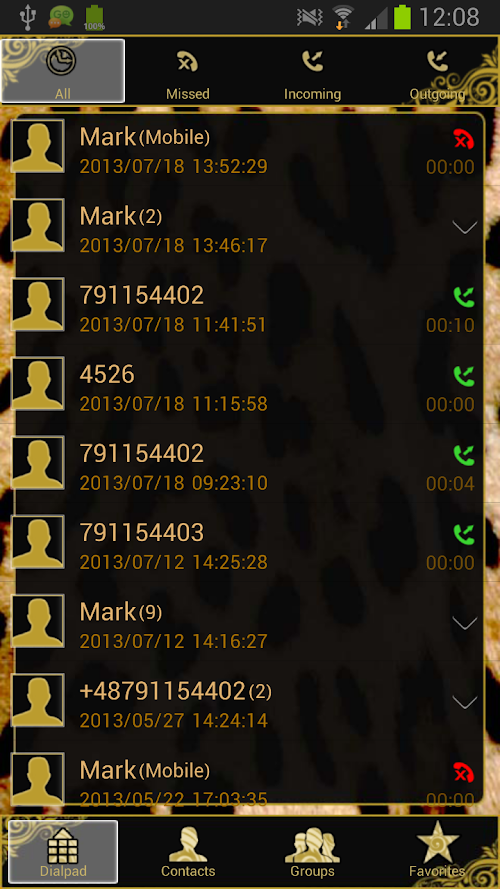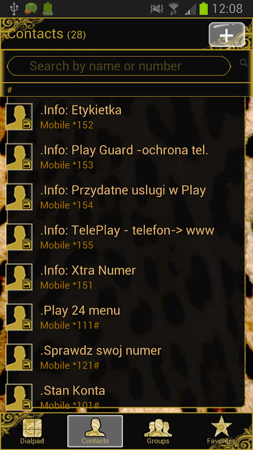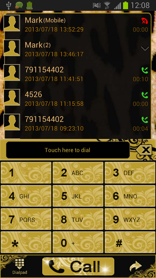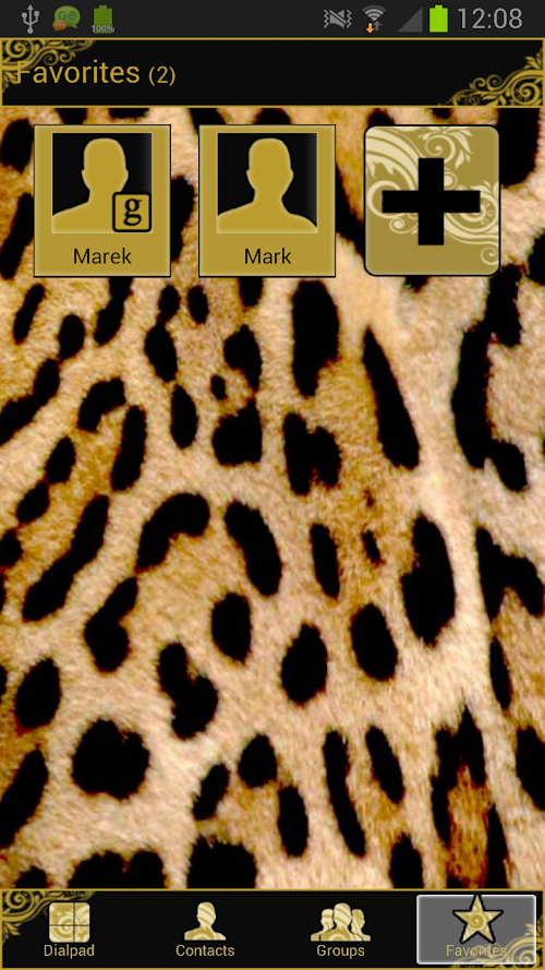 Theme of leopard skin. Skin was made in modern and trendy colors like golden and brown. Background of contacts list is leopard skin. Names of contacts are golden, date and time are brown. Keyboard keys are golden and have beautiful patterns, numbers and letters are black. Button for calling has gold background and black inscription. Other elements are gold and in shades of brown. If you like this theme please see our other project with leopard skin or with another animals likes zebra. Theme looks very original and modern.