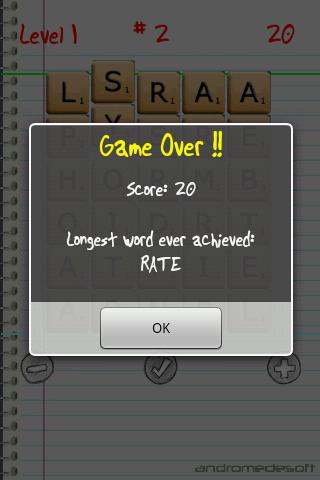 The objective is to build correct words with letters that the game provides, but you must hurry up and think fast, before the screen fills.