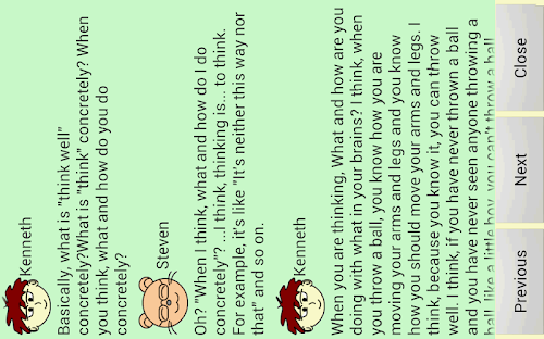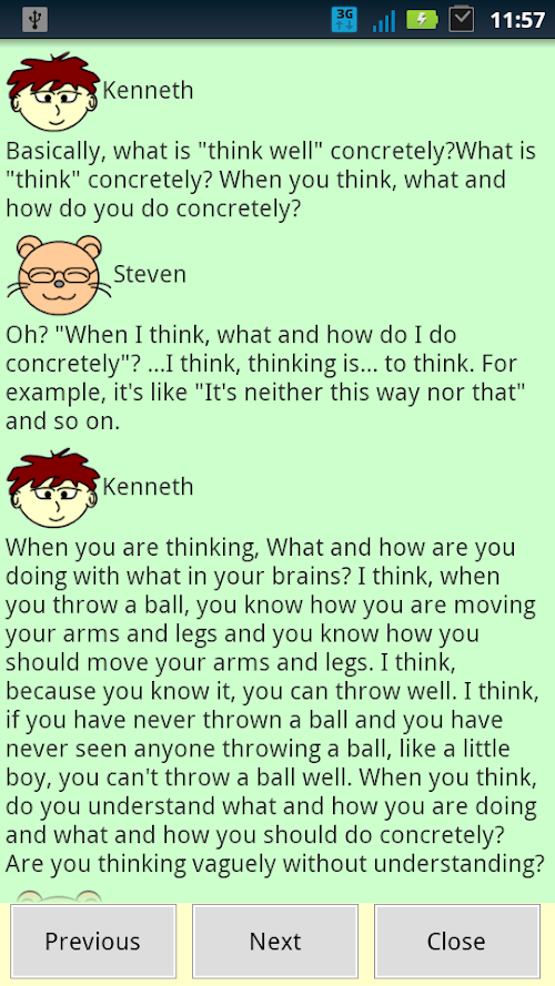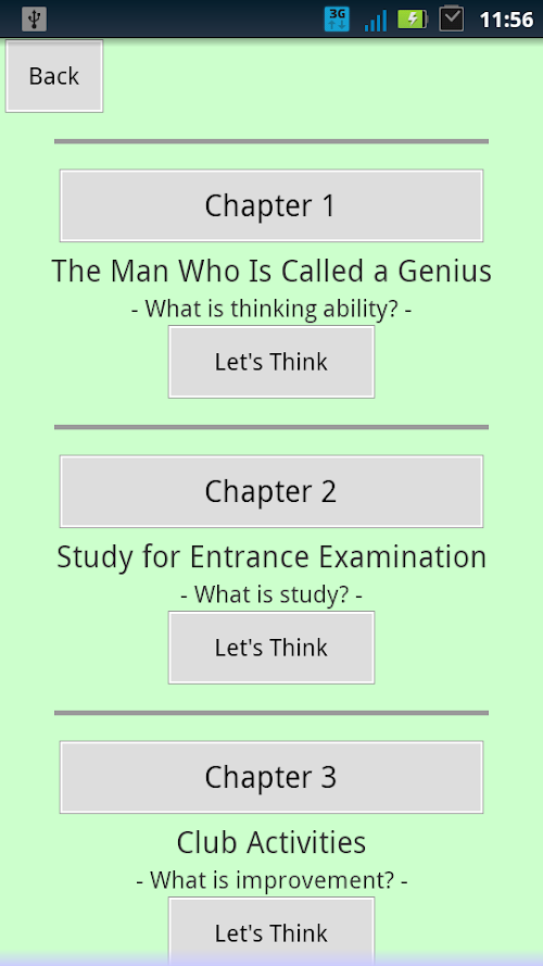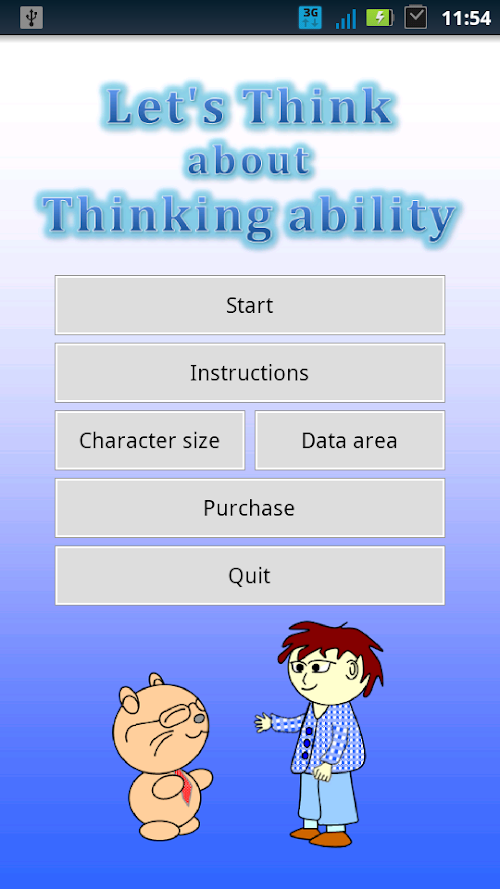 "Let's Think about Thinking Ability" has a story that heroes think about thinking essentially from close subjects. This application's aim is that you read heroes' talks and you concretely think what thinking is and you concretely understand when and what and how you should think and you can think better than you could. And this application's aim is also that you can always act according to circumstances and you can always get a good result efficiently by your effort and you can always efficiently improve your abilities, better than you could, on work and study and sports and life and so on.