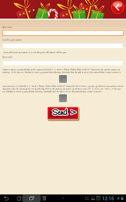 Write letter to Santa and tell him him what type of gift you would like to receive this year. In this letter write about your behaviour during this year and gift of your dreams. Your letter will be send do Santa, then he and his elfs will contact with your parents to ensure, that you were good this year, so remember to be honest writting letter.