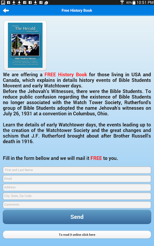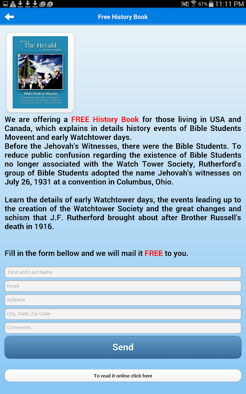 - FREE Book offered in mail: "After Armageddon...God's Kingdom". Explains in details how the Watchtower came to exist and how the truth progressed