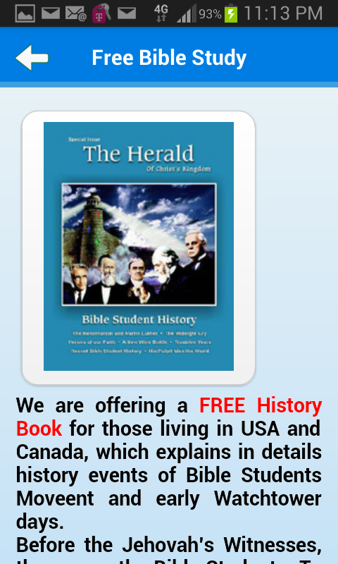 The History goes back to late 19th century when Charles Taze Russell established the Watchtower and Tract Society, started to publish the bimonthly Magazine - The Herald of Christ's Kingdom, and then a series of 6 volumes were published that uncovered all errors introduced by Satan and his agents. After Brother Russell's death major changes happened at the Watchtower. Read more in this app to learn of Bible Students history and teachings.