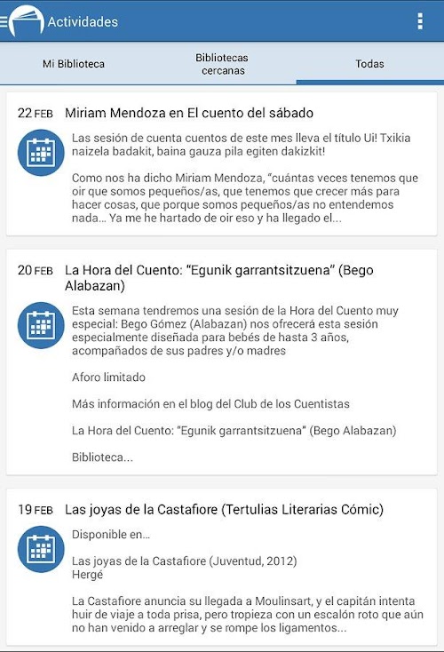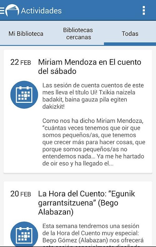 2 ) Actividades: relación de las actividades previstas por las bibliotecas de la Red, están geolocalizadas y segmentadas en tres niveles, las de mi biblioteca, las más cercanas a mi posición y las de todas las bibliotecas.