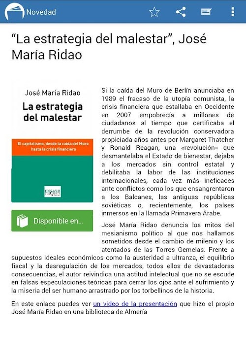 Its main objective is to allow the user to keep abreast of the news and activities of libraries, consult the library catalog and know the collections management, viewing multimedia content, geolocalizar libraries and blogs on the Internet, while promoting social participation through a set of actions that can generate an individual reputation based on interactions made within the application, such as comment and evaluate other, do check-in in libraries, as well as vote and share content via email, Facebook or Twitter.