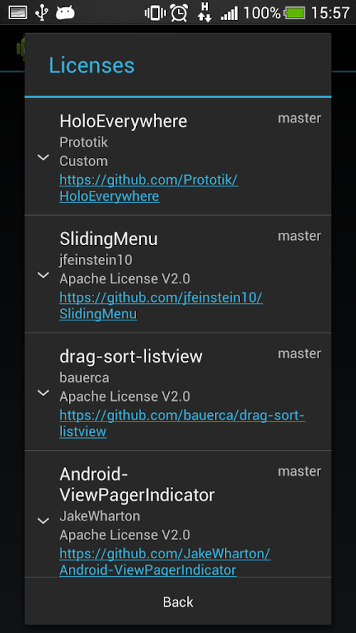 A license dialog with automatic list generation, which automatically loads the licenses from the internet. With very simple one line setup per license. It uses a DialogFragment to show the licenses of used libraries. It depends on the Universal Loader library…