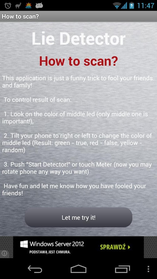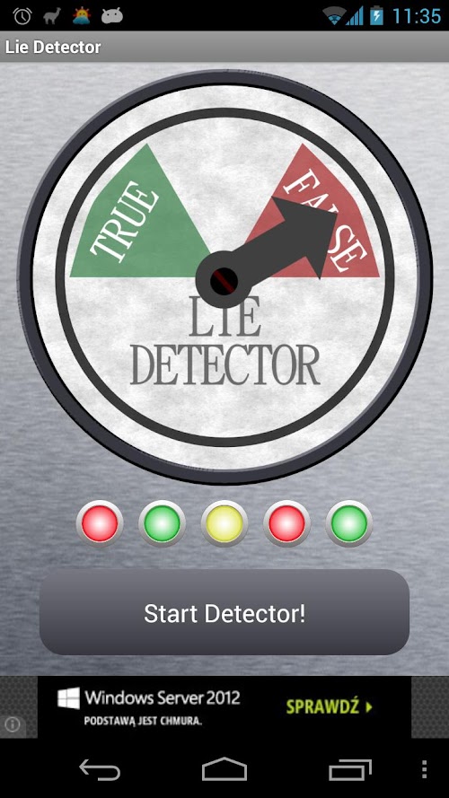 Great looking Lie Detector will make your kids or friends believe you can check if they are telling truth or lie! Great pictures and realistic sounds make this app great prank or kids controlling tool! You can control the result before even starting the scan!
