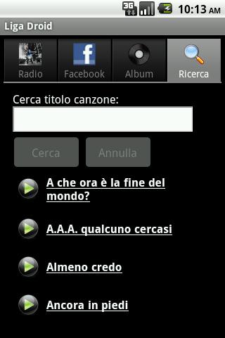 With Liga Droid you can listen Ligabue songs (radio in streaming and access lyrics to all of the songs.