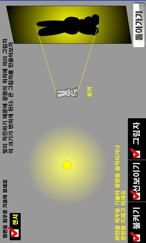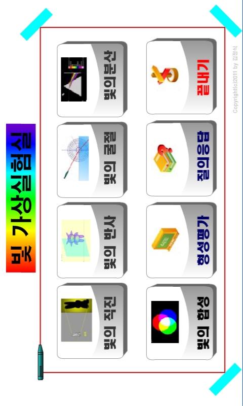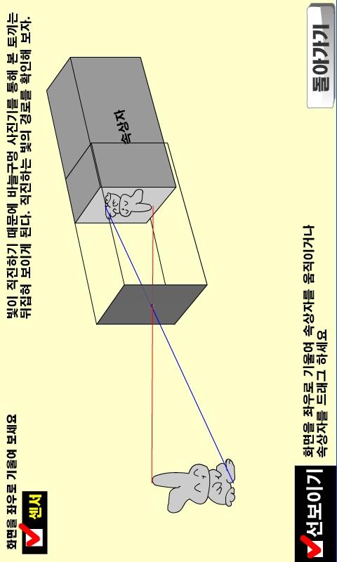 7. 우측아래 돌아가기 버튼을 두어 어떤 화면에서든지 앞화면으로 다시 이동할 수 있도록 하였다.It can be used when the class associated with the light in elementary school, junior high school science class and were to be used, as well as individual learning with the actual course of the experiment in class.