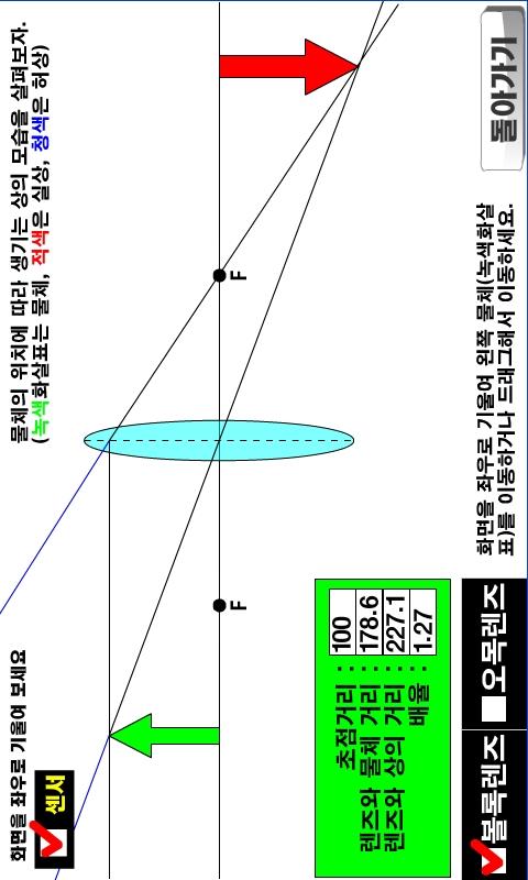 - Lens construction experiment: When the lens and the object using a virtual laboratory applications when performing experiments produced different depending on the location of the object in the case of a convex lens constructed experiments anywhere, and which can place different predicted saenggilji to look like real It can be compared with experiments performed experiments going