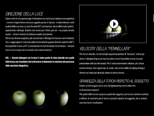 Abbiamo tradotto l’esperienza diretta in una applicazione sfogliabile, multimediale, da portare sempre con sé.The first guide on Lightpainting in Italian for iPad.