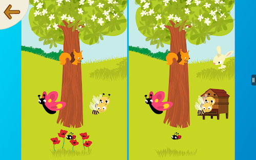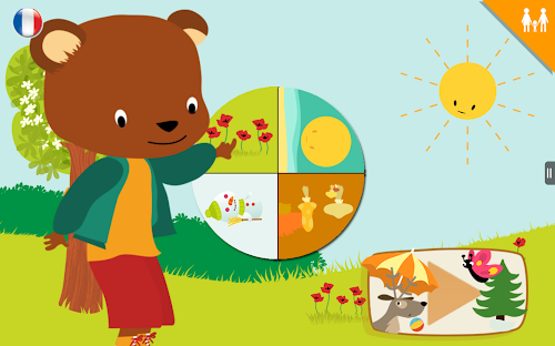 By putting the scenes that represent the seasons in the right order, or placing the bee near the hive and the pine tree near the log cabin, the child becomes acquainted with the concepts of alternating cycles within their natural environments. As well as this, the application also offers contextualized games to learn how to draw (straight lines, curved lines), to observe (spot the difference), to sharpen the child’s capacity of attention (fishing games).