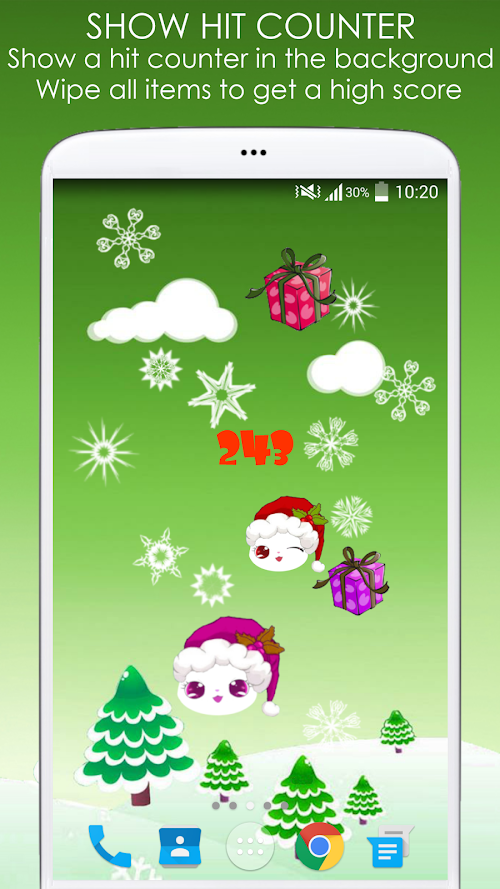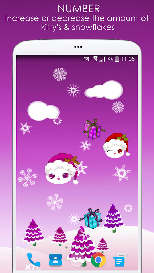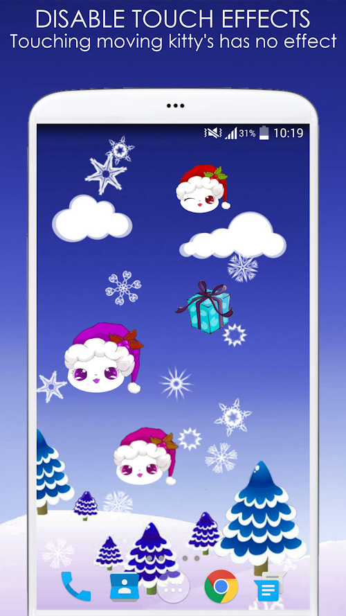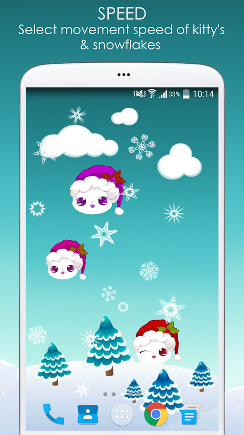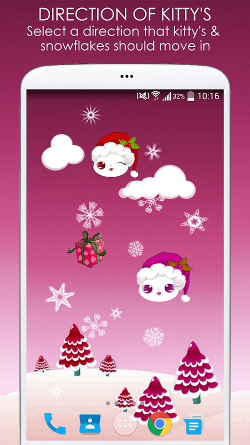 Lily Kitty Snow is a wonderful live wallpaper whith lot of kitty's and falling snowflakes. Whith Kitty Snow you can wipe away kitty's and other objects whith a simple touch. Also you can play, wipe as many kitty's you can (you can show or hide points in the background)