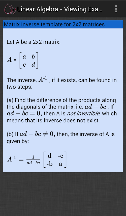 This app helps in these areas. You are given a large collection of typical Linear Algebra example problems. The problems are logically grouped by topic, and are interspersed with definitions and theorems, using wording that is as simple as possible to get the ideas across.
