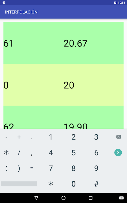 This application works as a linear interpolations calculator. It allows the use of a table when the exact value you look for it is omitted in this table through an interpolation between two known values.