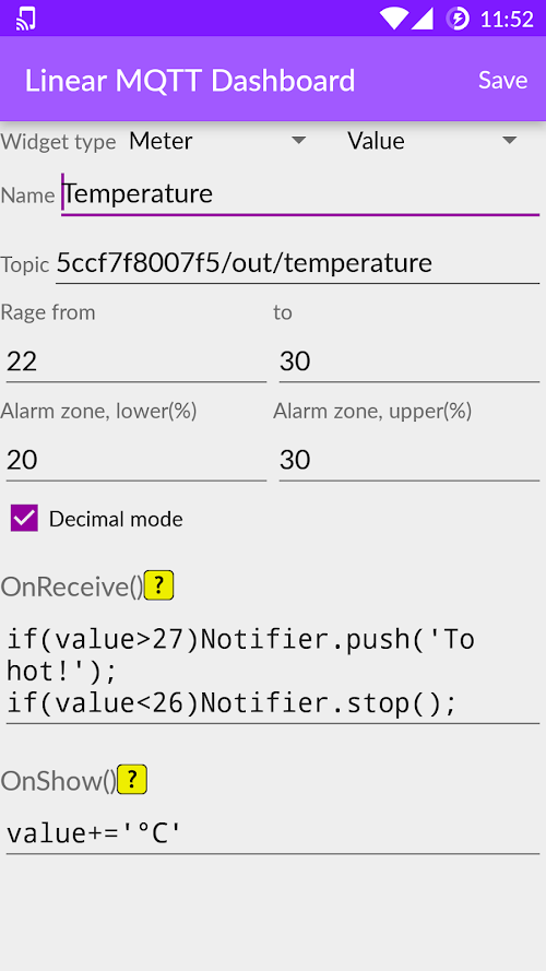 ★ Widget "Meter" can display the value of by a different color (alarm zone, yellow and red), if value approaches the limits of measurement. Thresholds limit values can be specified separately for the lower and upper boundaries.