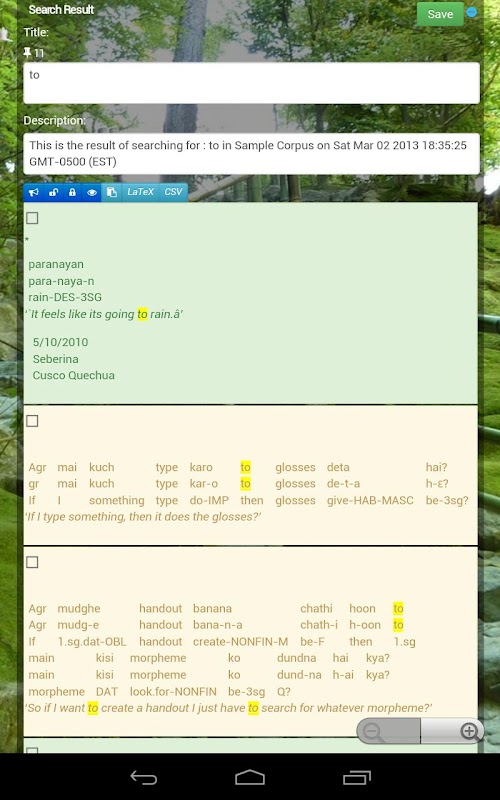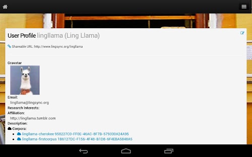 LingSync uses machine learning and computational linguistics to adapt to your existing organization of the data which you import and predict how to gloss it. LingSync already supports import and export of many common formats, including ELAN, Praat, Toolbox, FLEx, Filemaker Pro, LaTeX, xml, csv and more, but if you have another format you'd like to import or export, Contact Us.