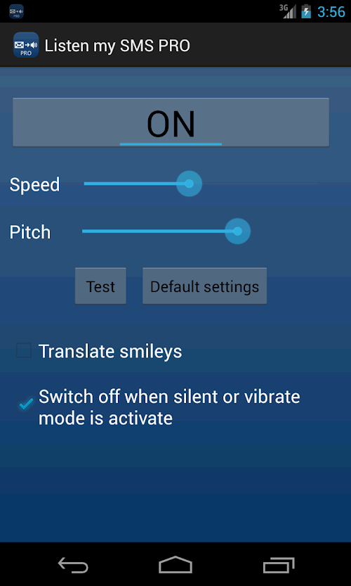 In this PRO version, you have a lot of settings, you can adjust the pitch and the speed of the voice, select the smileys translation, and stop the application when silence or vibrate mode is detected.