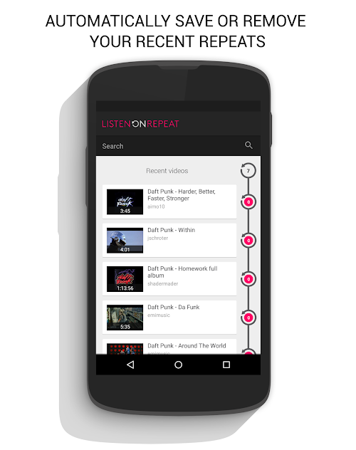 Listen to songs on repeat, or just put your favorite videos in an endless loop, discover new music curated by top blogs, and watch you repeat counter go up, up, up!