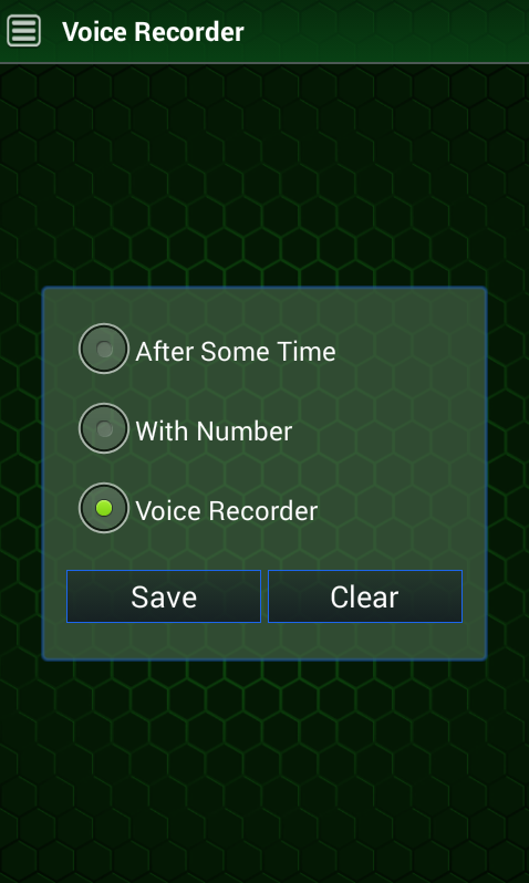 Voice and Surrounding recording can be recorded and managed in three modes 1. Activating by calling from a predefined phone number 2. Start recording after certain amount of time. 3. Manual recording. (1 and 2 options available in Pro and Stealth versions).