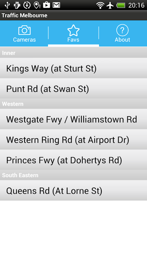 Ready to head home and you want to check the traffic? Live Traffic Melbourne is the fastest way to get to the traffic web cams that matter to you. Instead of browsing to a web site and working your way through the menus and map graphics to find a web camera just open Live Traffic Melbourne on your android and go straight to the camera you want with one click. Navigate through the other cameras along your route, in order, with a simple Next button.