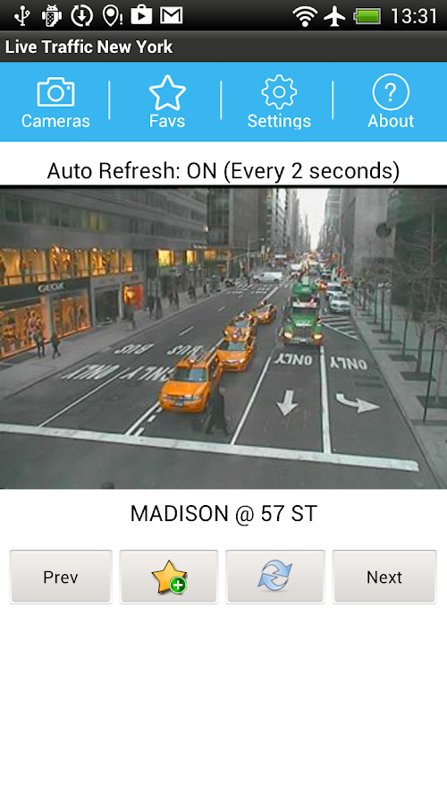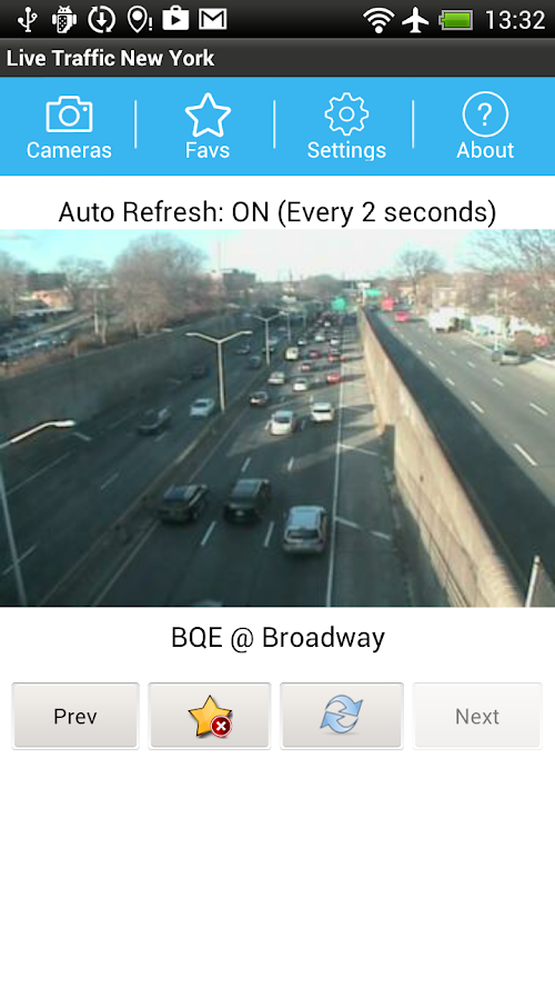 Ready to head home and you want to check the traffic? Live Traffic New York City is the fastest way to get to the traffic web cams that matter to you. Instead of browsing to a web site and working your way through the menus and map graphics to find a web camera just open Live Traffic New York City on your android and go straight to the camera you want with one click. Navigate through the other cameras along your route, in order, with a simple Next button.