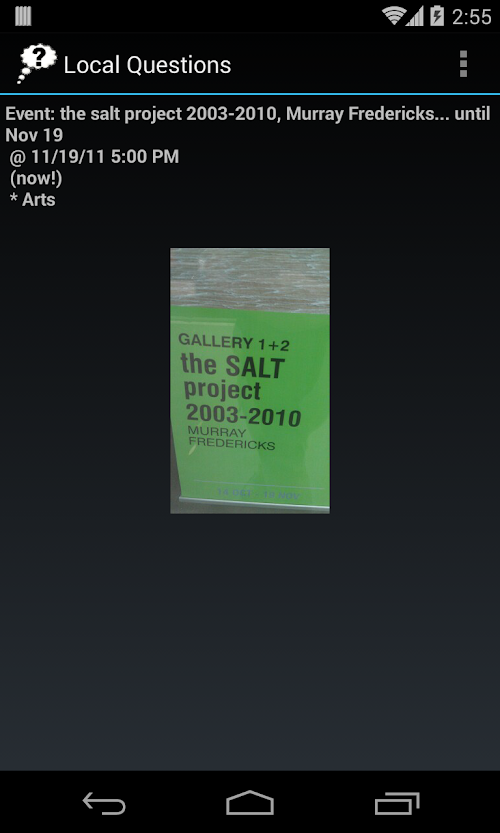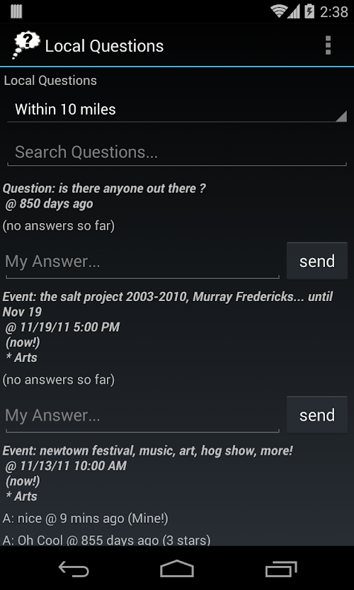 Send questions and receive answers in the local area. Ask a question, post a local event, advertise stuff for sale, and it will be sent to the local community of users near your location. Answer questions from users nearby your location. Include a picture from the camera as well. Anonymous and secure.