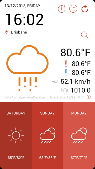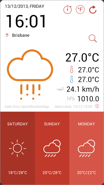 - Supports geo-positioning, retrieving the latest weather conditions for your current location