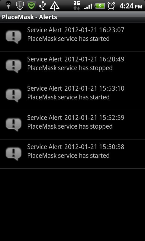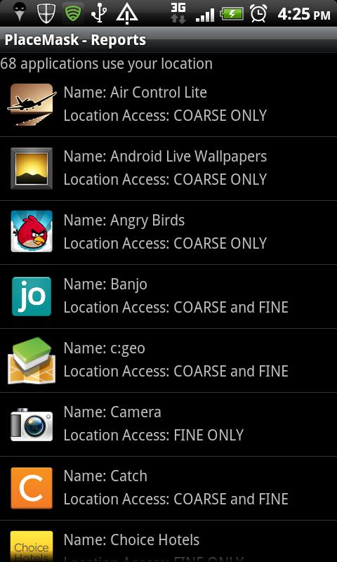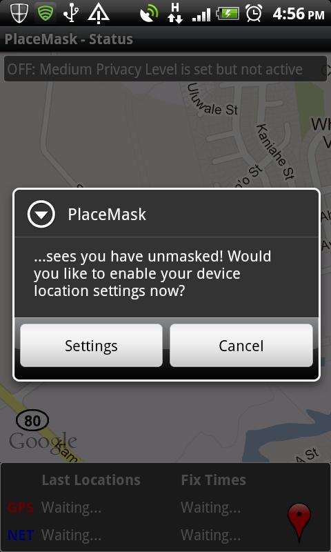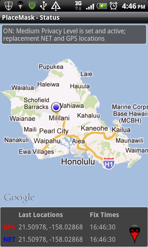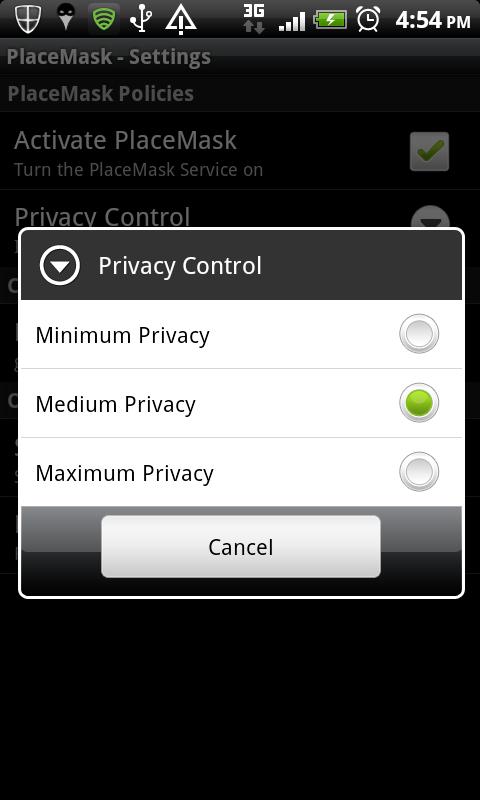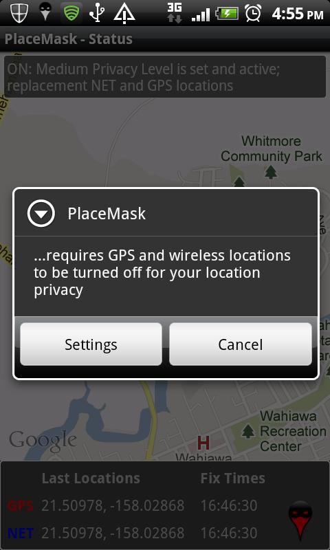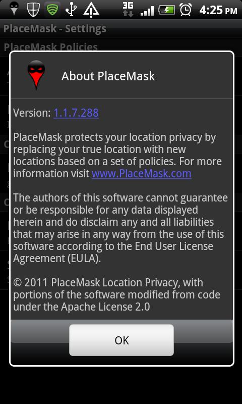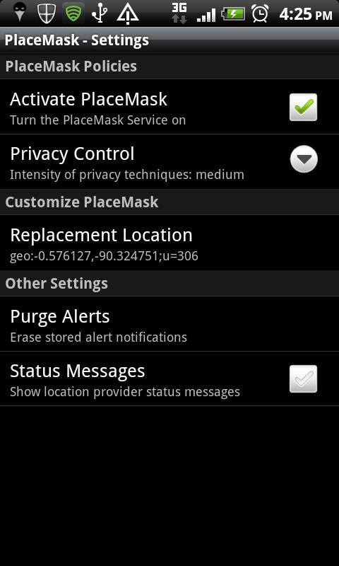 PlaceMask Location Privacy for Android™ is an application that protects your location privacy. It monitors the location settings of your device and provides replacement locations to the other applications to enhance your privacy. You may view the current status of the application through key settings overlaid onto a map view. You may access a list of alerts related to the operation of the application or retrieve a report of all the applications on your device that use your location in some way. The settings in PlaceMask Location Privacy allow you to adjust application parameters like privacy levels. You may find general information about the application, its license, and its authors in the about dialog. And of course, we have provided an easy way for you to recommend PlaceMask Location Privacy to a friend or colleague by launching a text message from the application.