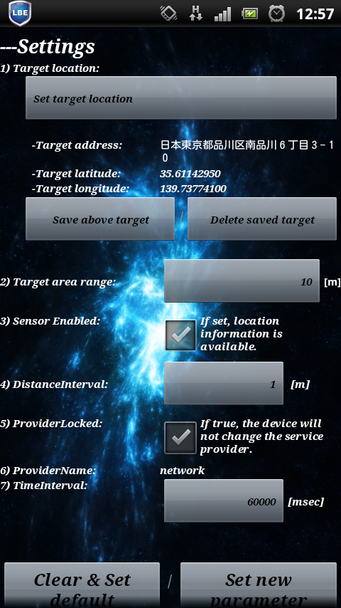 (9) [Set new parameter]ボタンを押し、設定を更新します。[Clear and Set Default]ボタンを押すと、「1) Target Location」のみが未設定となり、その他の設定は初期値がセットされます。