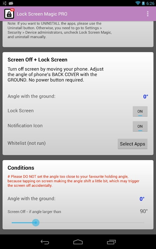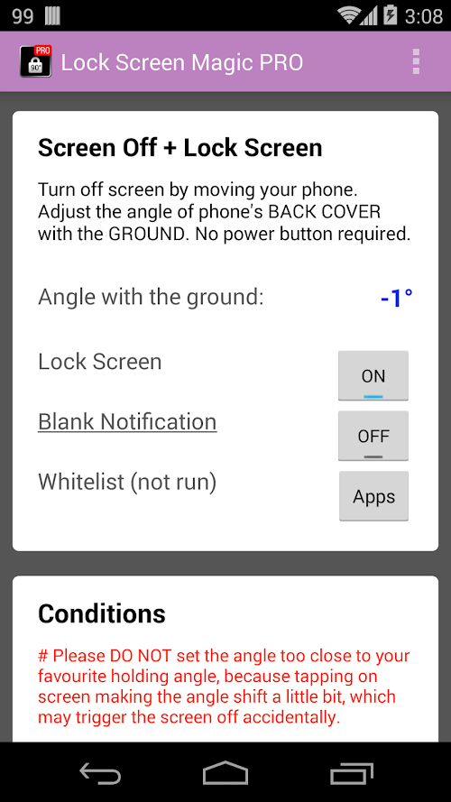 The app turn off and lock your screen by detecting the preset holding angle of the phone. It detect the phone's back cover angle with the ground and turn it off if it reach a predefined angle.